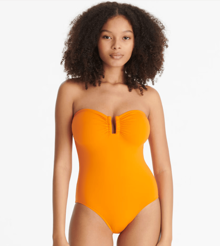 This iconic bustier one-piece, with gripper tape, can be recognised by its gathered cups separated by a U-shaped link. It enhances all body types.