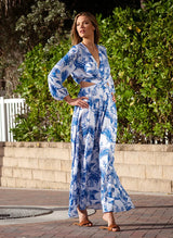 In the tropical-inspired ‘Palm’ print, the Anastasia Dress offers a glamorous addition to your day to night options. Falling to a dramatic maxi length, with v-neckline and long blouson style sleeves, the Anastasia boasts daring cut-out details at each side and on the reverse revealing your low back adding intrigue to the otherwise classic silhouette.