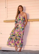 Celebrate in style this season in the Autumn Dress, part of the new 2025 Apres Beach collection designed to offer occasion wear with a signature dose of Odabash style. In graphic ‘Paradiso’ print, this asymmetric shape is gathered to create more volume in the top and sleeve. Cinched in at the waist with a fabric belt and the breezy skirt falls to a flattering midi length.