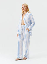 Take a relaxed approach to holiday dressing with the Krissy Trousers. An Odabash staple, this popular style has been updated for High Summer in white and blue Oasis Stripe. Crafted from pure cotton, this pair is cut for straight-leg fit with wide hems and two slip pockets at the hips. An elasticated waistband adds to their laid-back appeal, finished with signature gold branded cord-ends. Pair with the Tina Shirt to create a chic summer co-ord.
