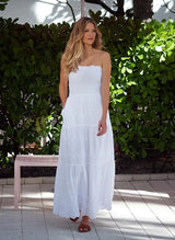 An essential when curating your elevated summer wardrobe this season, the Sophie White dress is crafted from pretty broderie anglaise cotton. The strapless top has a scalloped detailing along the neckline mirroring the same pattern on the hem. Made to be fitted through the bodice before falling into a breezy A-line silhouette on the skirt, finishing elegantly at the ankle.