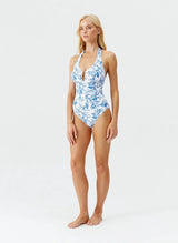Add the Tampa Blue Leaf Swimsuit to your destination wardrobe, part of Melissa Odabash’s 2025 Cruise Collection this halterneck silhouette has gained a cult like following and is refreshed this season in best-selling Blue Leaf print from smooth, soft, premium Italian swim fabric, with an impeccable cut made to flatter the body. The Tampa is a halterneck style, fastening at the nape of the neck with a golden trim and subtle ruching at the bust to elevate the piece.