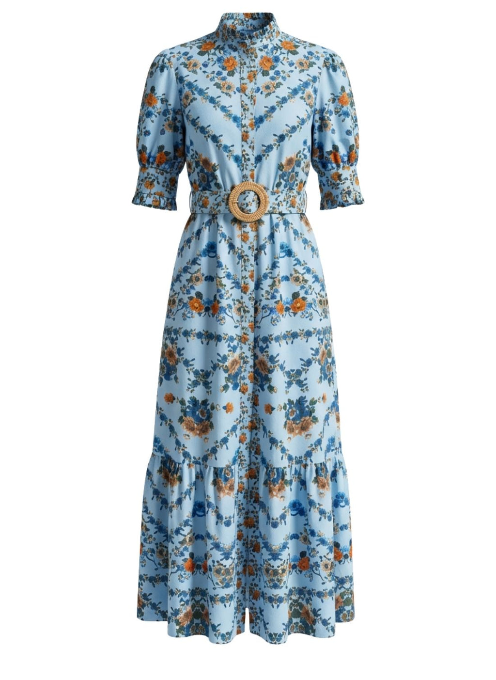 The best-selling shirt dress returns in our magical Blossom placement print, framed in hand-painted hues of blue, burnt orange, moss green and soft white. With its cinched waist, ruffled high collar and sculpted sleeves, it’s feminine, polished and effortlessly elegant. Finished with a wicker-style belt buckle, this cotton beauty moves easily from daytime ease to cocktail chic.