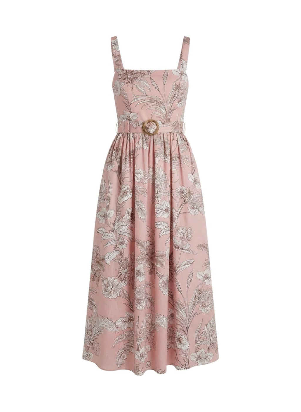 A clean, modern silhouette with a universally flattering square neckline. Ninet returns in the Jungle Pink placement print - warm pinks, framed by a new wicker-style belt buckle. Easy, uplifting and endlessly wearable.