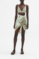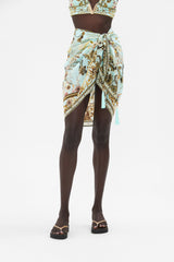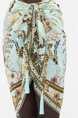 The Adieu Yesterday Short Tassel Sarong explores a mesmerizing sea of celestial blue hues finished with ornate golden swirls that dance alongside decadent botanical details and exquisite chain cascades. Crafted from a cotton-silk blend, this luxury sarong wrap is home to a multi-wear design complete with tie-up fastening, gold tassel detailing that shimmers amidst the sun, and a contrast panel trim.