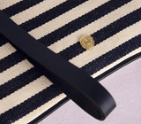 Canvas pouch with zipper, handle, navy stripes, and gold metallic details.