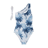 Marie Raxevsky's signature palm trees print in blue hues is a perfect match with the sparkling blue water and the smooth white sand! And when decorated on this elegant one-piece design with an open back and the one-shoulder detail? Well, that's a match made in heaven! Featuring a detachable white bow detail on the shoulder strap,as well as UPF 50+ sun protection.