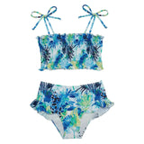Make a splash in the charming girl's high waist smocked bikini, adorned in the vibrant "Aquatic" print. A delightful burst of sea depths in vibrant blue and green hues creates a playful heaven that, all joyfully dancing to the rhythm of the season. This two-piece set combines style and functionality with smocking detail on the top, a flattering square neckline, and high-waisted bottoms. The playful "Aquatic" print, is inspired by the colorful allure of sea depth, adds a touch of tropical flair to every swim. Crafted from sustainable UPF 50+ fabric, ensuring your little one can enjoy endless hours of fun in the sun with peace of mind. Whether lounging by the pool or exploring sandy shores, this high waist smocked bikini is sure to become a summertime favorite.