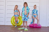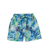 This pair of boy's swimshorts with the signature aquatic print for this summer in hues of green and blue, will surely make you daydream of sunny days by the beach. Featuring two side pockets, an elastic waistband with a navy blue drawstring detail & yellow studs, as well as a velcro flap pocket on the back, get ready to embrace the play & chill vibes to the fullest. The internal mesh brief provides ultimate comfort and ease. UPF 50+ sun protection is provided.