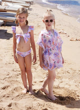 The Tie Knot Bikini in romantic print, a chic choice for your young fashionista. The captivating romantic print, featuring a spectrum of garden hues, graces this two-piece set with a trendy bandeau neckline and playful ruffles on the straps. Crafted from premium, quick-drying and sustainable fabric and boasting UPF 50+ sun protection, this girly ensemble ensures sun-soaked playdates are carefree. Complete with a detachable tie knot/bow detail on the front and a matching bikini bottom, it's the perfect companion for beach adventures and sunny escapades. The romantic design brings a touch of seaside gardens charm, making this bikini a delightful addition to your little one's summer wardrobe.
