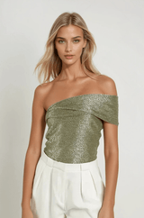 Pleated knit with speckled foil bodysuit with an asymmetric off-the-shoulder gathered detail, and invisible zipper at the back.