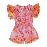Let your little one immerse herself in the enchanting beauty of a blooming garden with the delightful girl's playsuit. Inspired by the whimsy of nature's wonders, this playsuit features a delightful array of, flowers, and leaves dancing in hues of orange, pink and purple. The playful combination of colors and patterns evokes the joy and vibrancy of a flourishing botanical garden, adding a touch of whimsical charm to every wear. Crafted with comfort and style in mind, this playsuit boasts a relaxed fit and a cinched waist for a flattering silhouette. Whether exploring sunny meadows, attending garden parties, or simply enjoying playtime in the backyard, this "Botanical Lilac" print playsuit is sure to become a favorite summer staple.