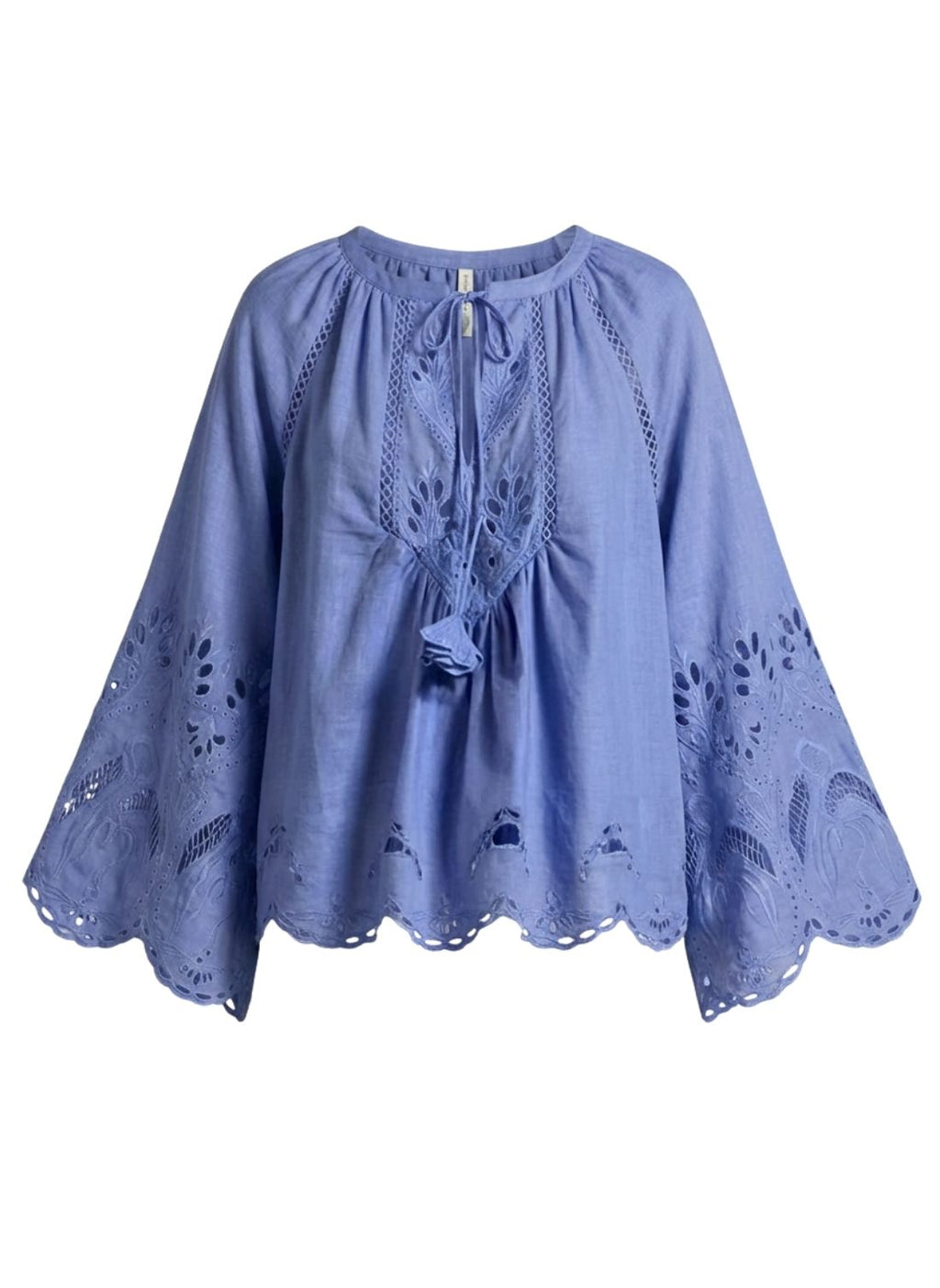 Featuring delicate flamingo embroidery, lacework on the straight-cut sleeves, and handmade tassels, the ASHU TOP captures a carefree, natural spirit.