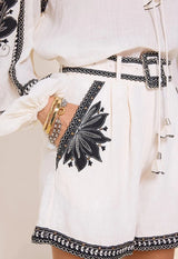 Radiate timeless sophistication with the Love the Moments Shorts. Crafted from heavy Linen, these shorts feature a buckram-fused stiff detachable belt with deco lace edges, providing a chic and structured look. The contrast applique embroidery, adorned with antique brass sequins and hand-beaded details, frames the side pockets and hems, adding a touch of elegance.