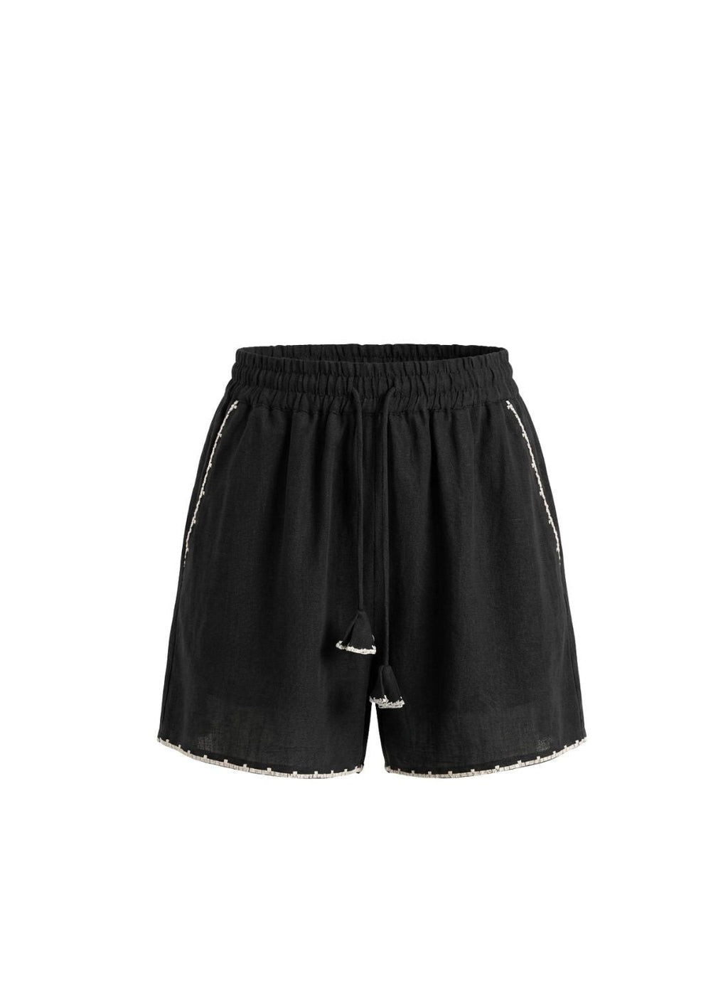 The PALLAZ SHORTS are the epitome of casual chic. These shorts with delicate embroidery along the hems are designed to elevate your summer style effortlessly. With a high, waist and straight legs, they offer a flattering silhouette that's both comfortable and on-trend. The full elasticated waist ensures a perfect fit, while the drawstrings with embroidered tassel endings add a touch of charm. Slip pockets provide practicality without compromising style.