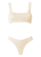 High-rise bikini in seersucker fabric with squared neck. Free from wiring or padding, so you can comfortably lounge or swim in it.