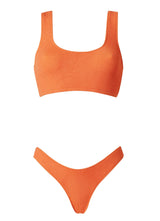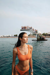 High-rise bikini in seersucker fabric. Free from wiring or padding, so you can comfortably lounge or swim in it.