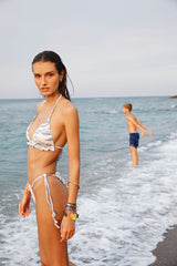 Triangle frill bikini with removable light padding at the top and adjustable ties. Excellent fit.