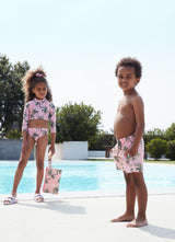 Get ready for a tropical escapade with these charming boy's swim shorts in the captivating Cuba print. Inspired by the vibrant colors and lively atmosphere of the Caribbean, these swim shorts are a must-have for your little adventurer's summer wardrobe. Featuring a dynamic blend of rich hues and playful patterns, they exude the essence of island paradise. The elasticated waistband ensures a comfortable and secure fit, while the adjustable drawstring allows for personalized adjustment. Two side pockets provide convenient storage for seashells and treasures found along the shoreline, while a velcro flap pocket at the back offers additional functionality. Crafted from quick-drying fabric , these swim shorts combine style and practicality for endless hours of fun in the sun.