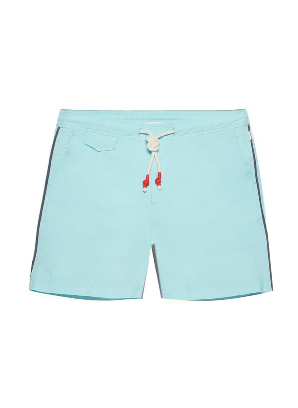 These Standard swim shorts will make a great addition to your swimwear collection in bright Clear sky blue. In addition to the signature tubular drawcord with white and red rubber seals, these mid-length swim shorts also boast sophisticated contrast piping on the sides.