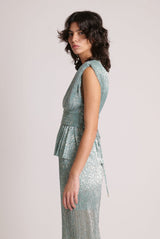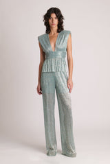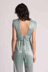 Pleated knit with multi-dot foil deep V-neckline top, padded shoulders, open back with adjustable strap, and lacing fastened with a metallic button.