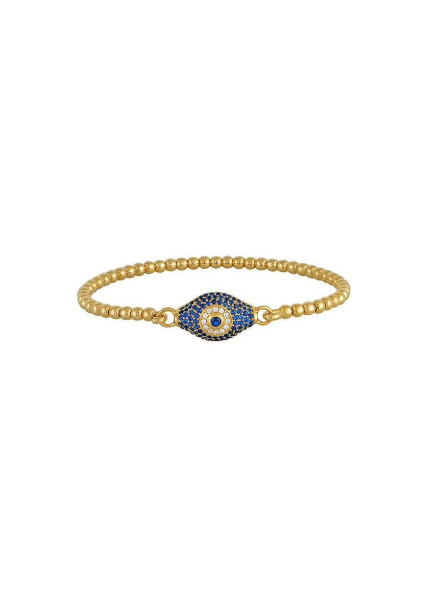 The blue Mini Gala bracelet has a beaded wire band with a tension hook fastening and a blue and white crystal encrusted eye motif. 22 carat gold plated Sterling silver. Two sizes XS/S (to fit wrist circumference 14cm to 15.5cm) and M/L (to fit wrist circumference 16cm to 17.5cm).