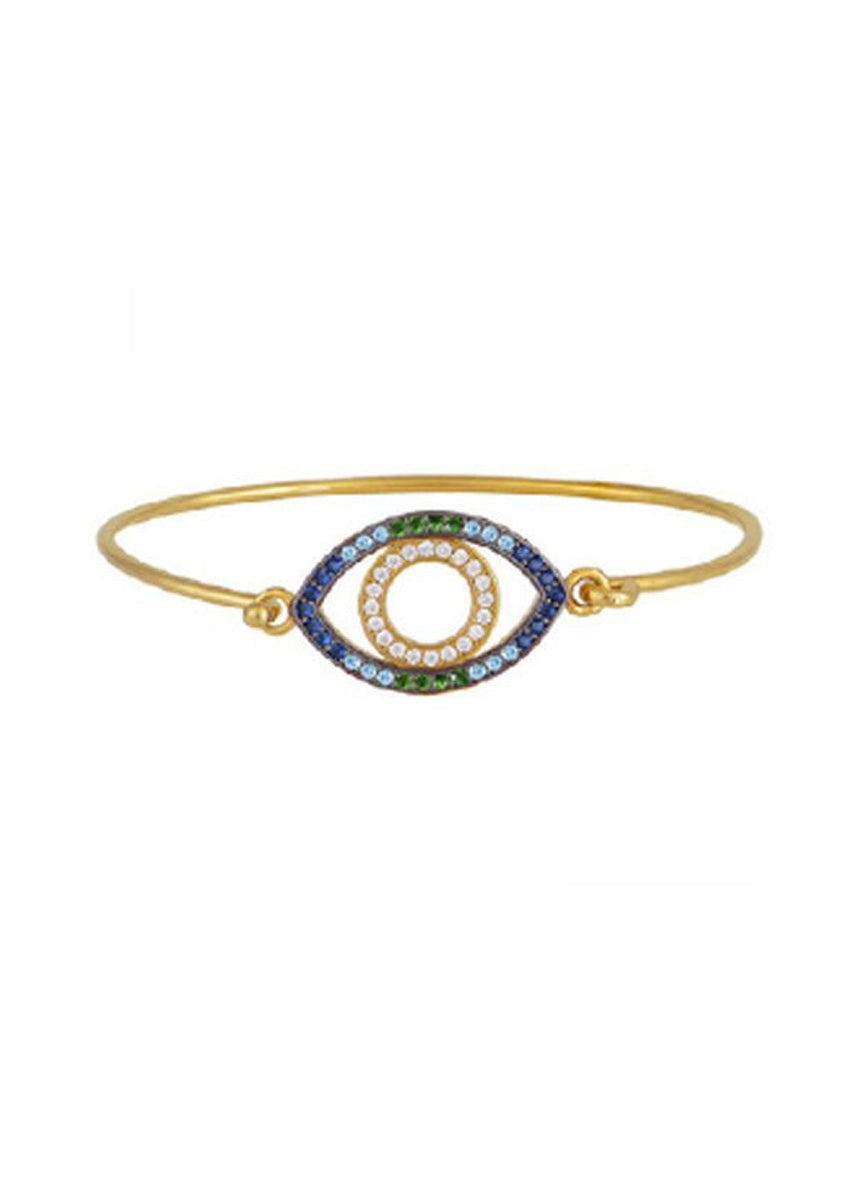 A tension hook fastening bracelet, the Maia blue fade bracelet features a blue, aqua and white crystal set eye motif around a circlet of white stones. 22 carat gold plated Sterling silver. Eye motif width 23.5mm. Two sizes XS/S (to fit wrist circumference 14cm to 15.5cm) and M/L (to fit wrist circumference 16cm to 17.5cm).