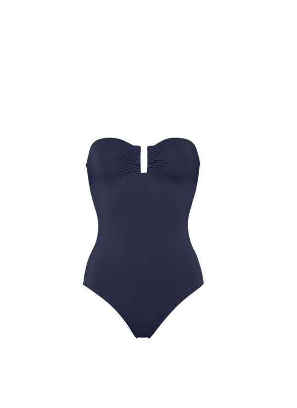 This iconic bustier one-piece, with gripper tape, can be recognised by its gathered cups separated by a U-shaped link. It enhances all body types.