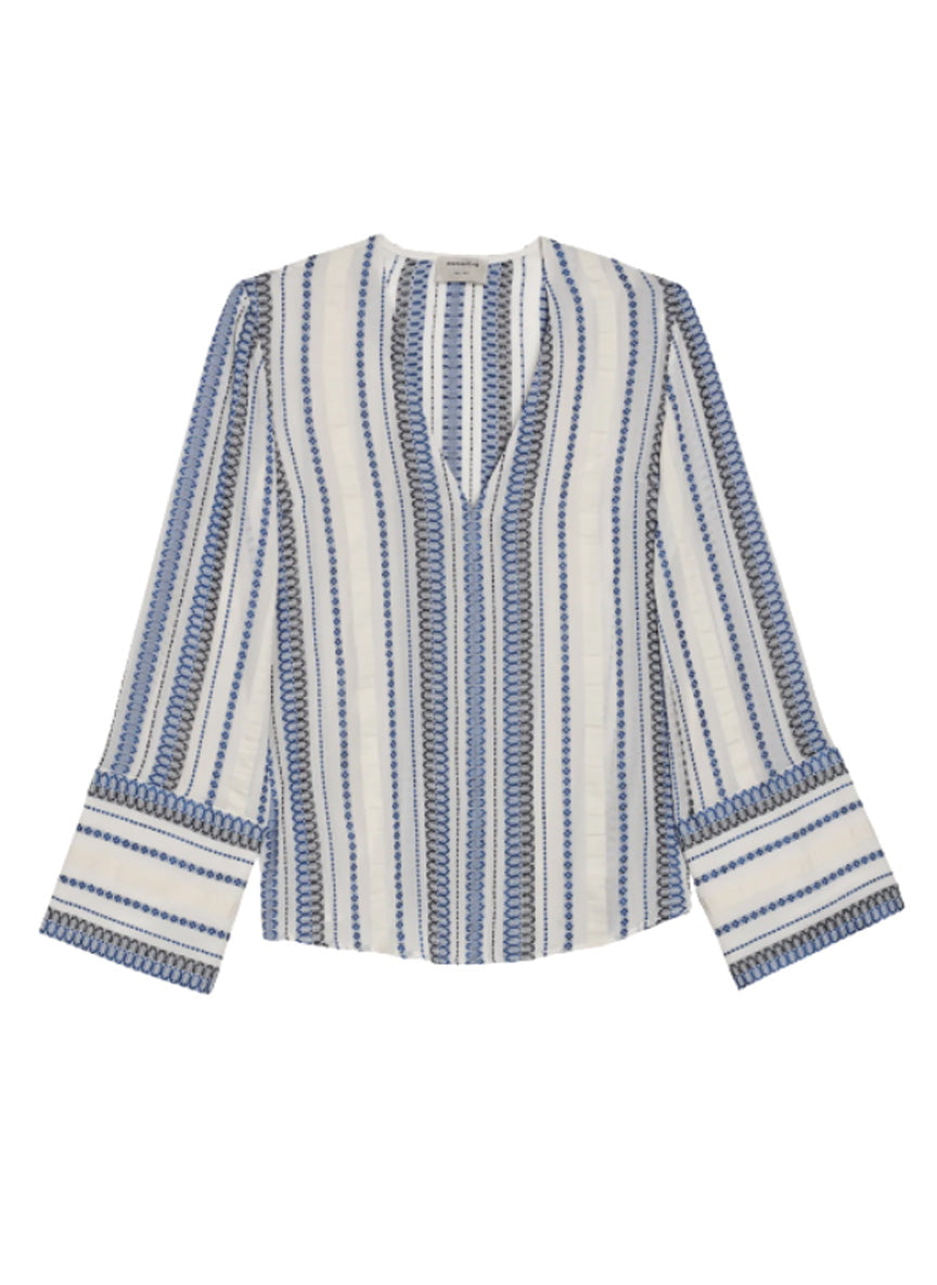 The 'Orion' blouse is tailored in a relaxed, slightly boxy silhouette and crafted from signature spathoto jacquard silk in ivory, woven with navy threads. It features a V-neckline and wide sleeves with split cuffs, lending the piece an effortless sense of fluidity.