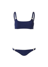 Give your swimwear contingent a sporty update in the Bari Bikini. Cut from premium Italian fabric with added SPF 50+ protection, it boasts a pared-back, minimal silhouette, enhanced by a ribbed finish. Its sleek ‘Navy’ hue is beautifully offset with golden rings on both the top and bottoms. The simple bralette top features a clasp fastening, paired with hipster bottoms. Wear beneath a Melissa Odabash kaftan as you travel through the resort to the beach.
