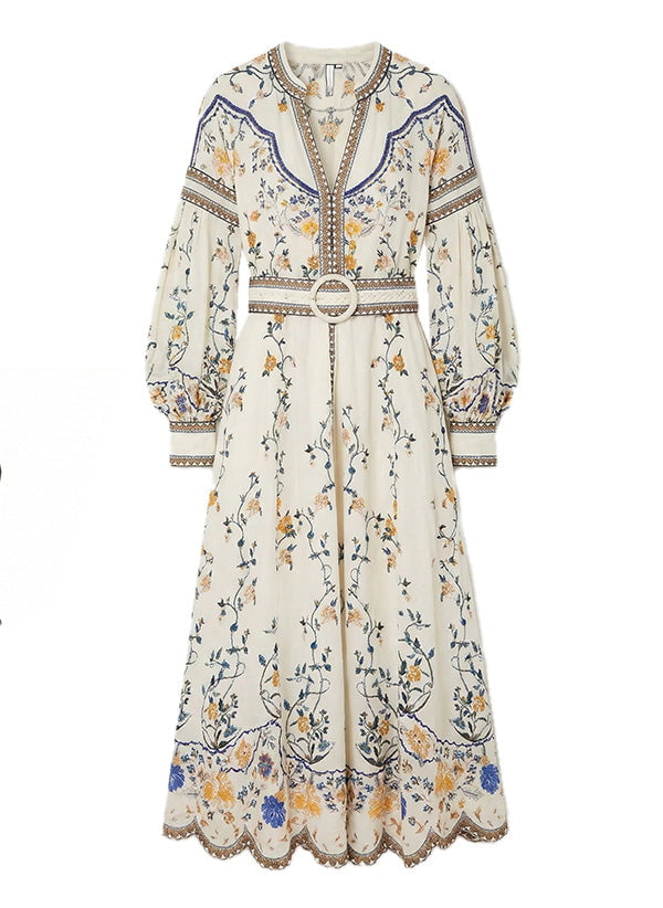 A detachable buckled belt accents the silhouette, while hand-beaded artisanal work enhances the all-over floral print. Perfect for any occasion, this dress blends artistic inspiration with meticulous detailing, offering versatility and elegance for your wardrobe.