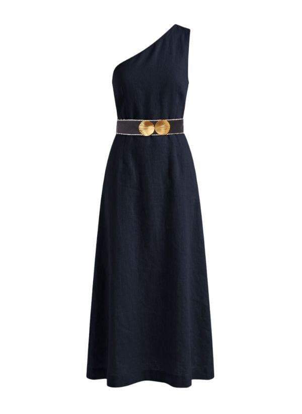 Ino Linen One Shoulder Dress Golden Shell Buckles Navy Blue