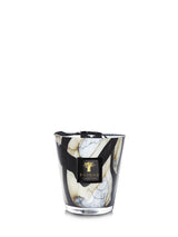 The scented candle is set in a hand-blown glass replicating grey marble with black strokes edged with beige. The elegance of the glass reveals the flame, giving an effect of a luminous stone.