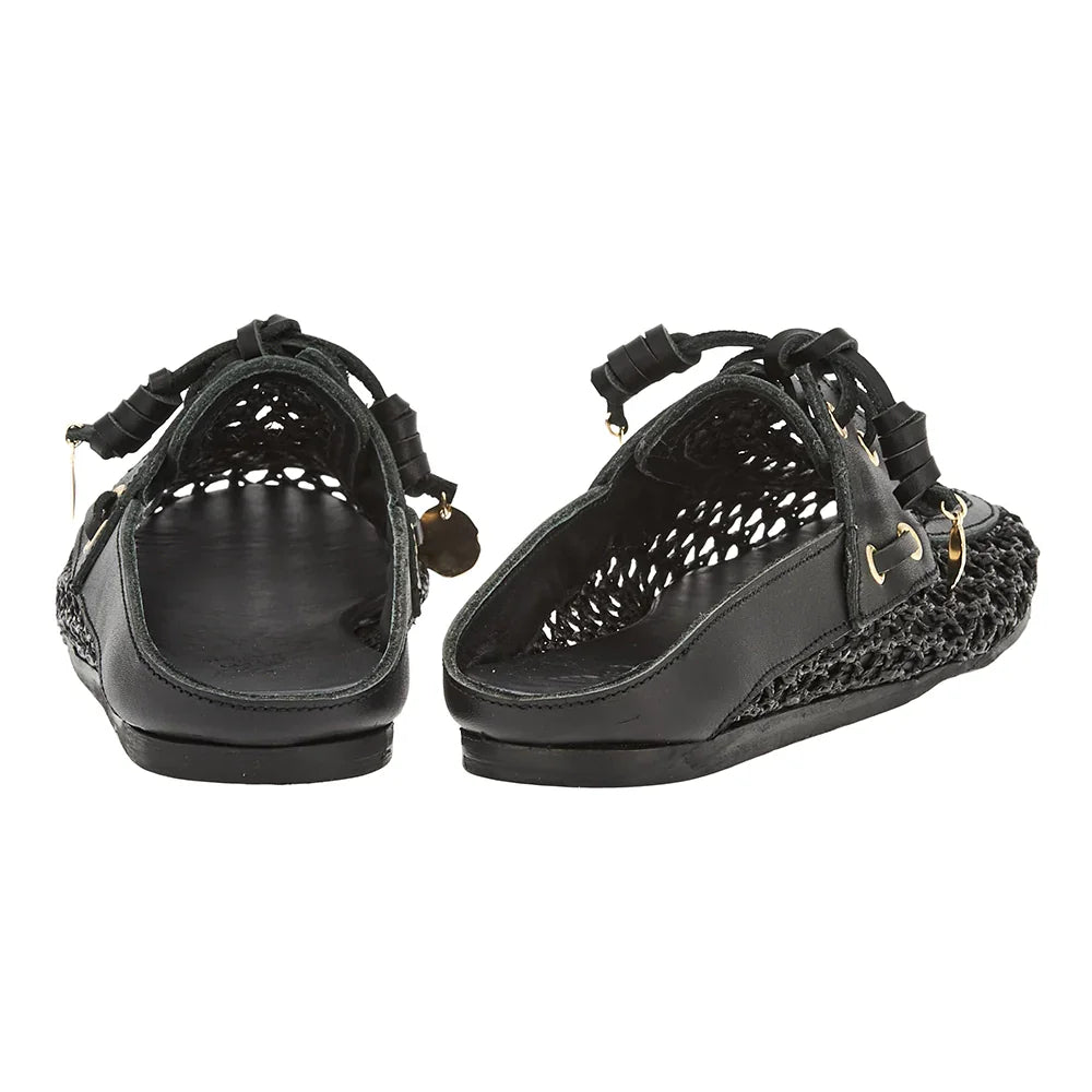 Crafted from open-weave raffia and trimmed with luxurious Vachetta leather, this design retains signature elements such as knotted laces and coin charm details, adding character and artisanal appeal. The slip-on silhouette ensures ease of wear, making it ideal for everyday summer styling.