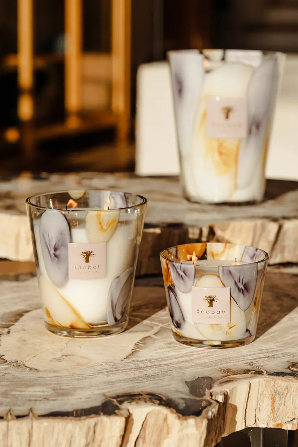 Refinement takes center stage in your home with the Eilenroc scented candle, in delicate mauve and saffron yellow. It perfectly matches the Art Deco world of the villa on the Riviera whose name it bears. The glass, hand-blown by our glassmakers, is dotted with colored circles in a subtle blend of mauve and saffron yellow.